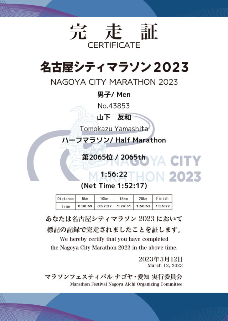 「ハーフマラソンの公式記録証」で、山下社長のタイムを突破せよ。